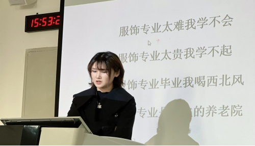 饶蕾老师则通过介绍2022届服装与服饰设计专业毕业展《游目》,深入分析了服装设计专业在新疆本土的成长机遇与未来前景。她鼓励员工们勇于创新,将新疆的文化特色融入设计实践中,为有意向选择服装与服饰设计专业的同学打开了新的视野。